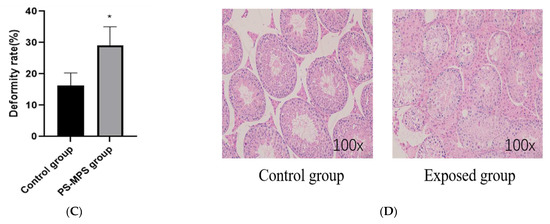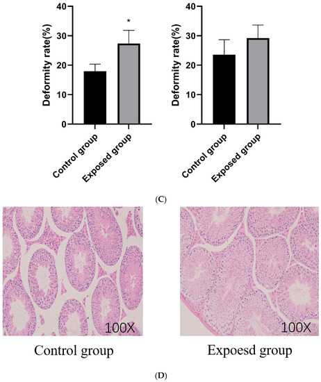 Sperm quality of mice and structure of the testis after exposure period. (A) Sperm survival; (B) Forward motion; (C) Deformity; (D) HE staining results of mice testicular tissue. The data are expressed as the mean ± SD (n = 8) and analyzed by dependent sample t-test. Note: * p < 0.05, indicates a statistically significant difference from the control.