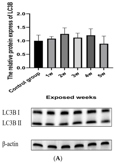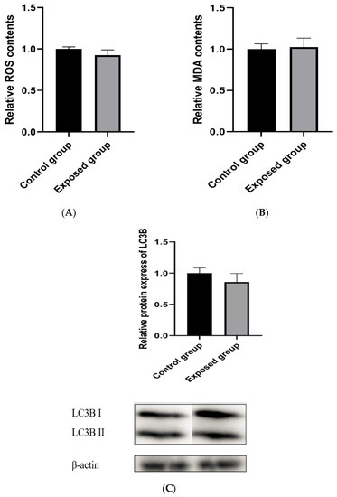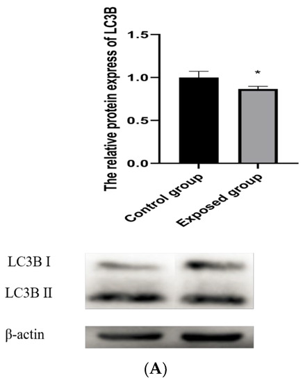 As shown in Figure 3A, the protein contents of LC3BⅡ were decreased in the exposed group. Mitochondrial autophagy was also decreased.