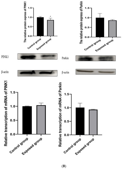 As shown in Figure 3B, the protein expression of PINK1 and Parkin decreased in the exposed group, but the mRNA levels of the PINK1 and Parkin genes did not change compared with those in the control group, and the difference was not statistically significant.
