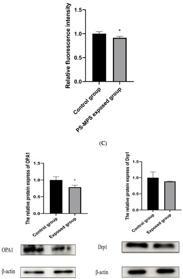 As shown in Figure 3C, the mitochondrial membrane potential of exposed mice was significantly lower than that of the control group, and the difference was statistically significant.