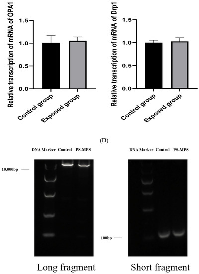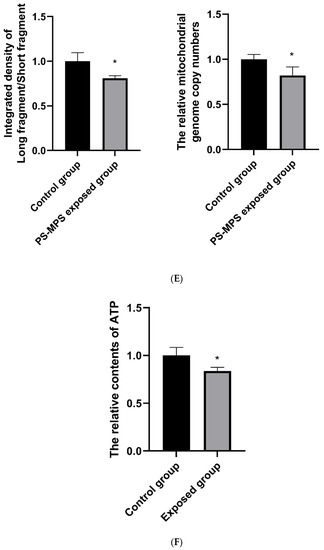 As shown in Figure 3E, compared with the control group, the mitochondrial gene integrity and copy numbers in the exposed group were decreased, and the differences were statistically significant.