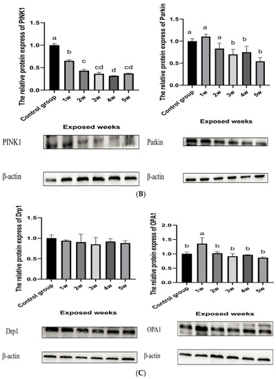 As shown in Figure 5C, with the prolongation of the exposure time, the ROS level gradually increased, reached the highest level in the second week, and maintained this level. The expression level of the PINK1 protein reached the highest level on the fifth day of exposure and decreased one week later, and the difference was statistically significant.
