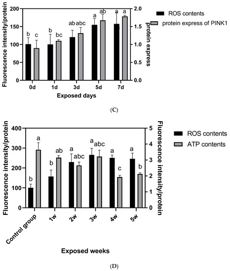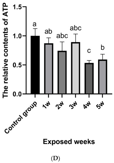 As shown in Figure 5D, with the prolongation of the exposure time, the ROS level gradually increased, reached the highest level in the second week, and maintained this level. The ATP content decreased and reached the lowest level in the fourth week.