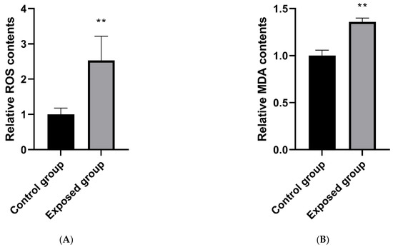 As shown in Figure 5A, the ROS level in the testicular tissue of the exposed group was significantly higher than that of the control group.