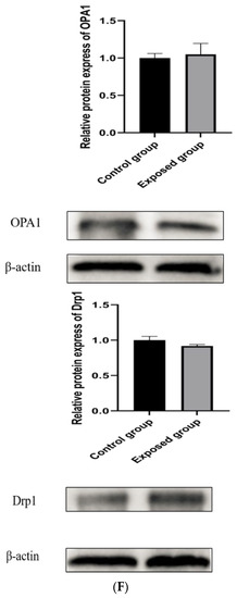 As shown in Figure 3D, the expression of the mitochondrial fission protein Drp1 and fusion protein OPA1 decreased in the exposed group, and the difference was statistically significant, but the mRNA levels of the Drp1 and OPA1 genes did not change compared with those in the control group, and the difference was not statistically significant.