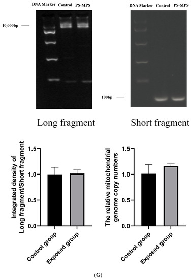 As shown in Figure 8G, after the first recovery period, there was no significant difference in the mitochondrial genome integrity and copy number of the testicular tissue between the exposed and control groups.