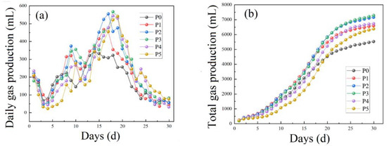 The gas production of each anaerobic digestion tank was recorded every day and presented in Figure 2a. The overall gas production law of anaerobic digestion rapidly decreased from about 200 mL to about 50 mL in the first 4 days and increased from 5th day. All groups reached the peak value of gas production between the 15th and 18th day. The daily maximum gas production of the P0–P5 group was 342, 467, 555, 567, 544 and 541 mL, respectively. The daily gas production gradually decreased and remained below 100 mL after 18 days.
