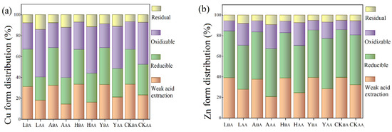 Effects of different inorganic passivators on the distribution of the form of (a) Cu and (b) Zn. BA: before anaerobic digestion; AA: after anaerobic digestion.