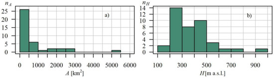 Gauging cross sections enclosed basins of surface areas ranging between 23.9 km2 and 5317.3 km2, whereas the gauge elevation was between 184.7 m a.s.l. and 965.6 m a.s.l. The arrangement as well as the relationship between basin area A and the gauging station elevation H is presented in Figure 2.