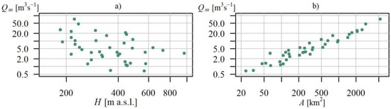 Scattergraph of relationship between average flow Qm and: (a) catchment area A; and (b) gauging station elevation H, in Polish Carpathian, in the logarithmic (log-log) scales.