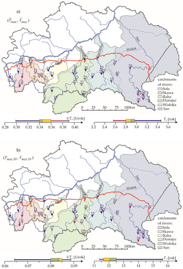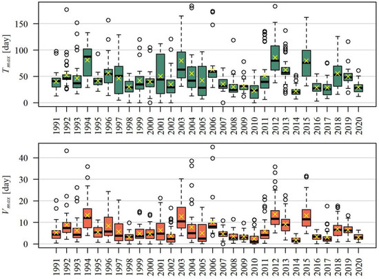 The most unfavourable droughts, considering the socioeconomical consequences, as well as the most interesting ones from the practical perspective, for example in view of assessing the risk of a maximum drought occurring in a given cross section, are the longest droughts and/or the ones with the largest volumes. Such droughts are known as maximum [13,14] or extreme [1,15] droughts. This study discusses two annual maximum droughts: of the longest annual duration Tmax, and with the largest annual volume Vmax. The selection of these droughts allows for the calculation of the frequency (probability) of occurrence of a maximum drought with a given duration or volume.