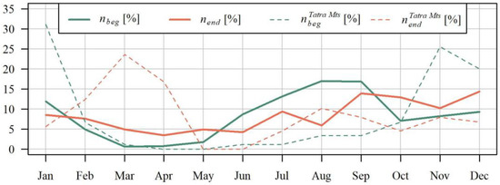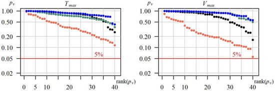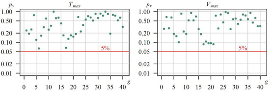 Given was the time series Xi (Xi = Tmax,i or Xi = Vmax,i), i = 1, 2, …, n. The Mann–Kendall test [58,59,60] verified the hypothesis H0 of the homogeneity of the time series Xi (more specifically, variables Xi, i = 1, 2, …, n were independent and had identical distributions), with the alternative hypothesis H1 of the presence of a monotonic trend.