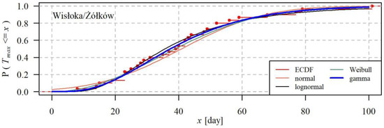 where F(⋅) is the cumulative distribution function of the tested distribution, whereas X(i), i = 1, 2, …, n, is the i-th value of the random sample (i.e., duration of volume of the maximum drought) in ascending order.