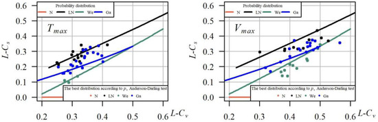 3.4. Probability Distributions of the Tmax, Vmax Series