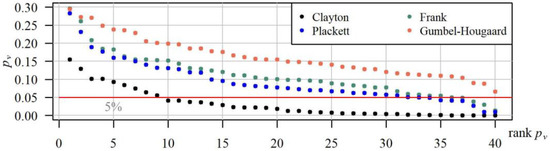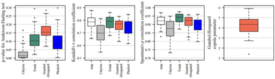 In the literature, the widely applied goodness of fit tests for joint distributions are: the Cramer-von Mises test [24,30], χ2 [14] test, or the RMSE criterion [23,26,73]. Genest et al. [74,75] recommend the use of the Cramer-von Mises or Anderson–Darling tests.