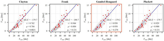 Similarly to the univariate perspective, in which for defining the duration and volume of maximum drought in gauging cross section g the best distribution was sought from among the chosen set of distributions, also the identification of joint distributions of variables and consisted in selecting the best probability distribution of variable , constructed based on one from the set of the proposed copulas.