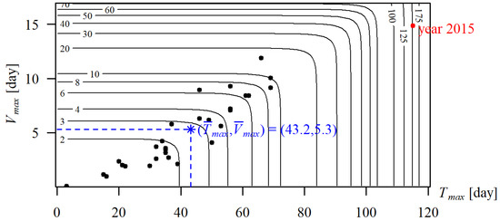 Return periods of each variable Tmax and Vmax analysed separately provide information on each individual variable. Therefore, the value of the return period of variable Tmax was calculated for all of the values of Vmax and vice versa, and the obtained result was, in a way, over- or underestimated. This is why a return period which concerns both variables Tmax and Vmax at the same time is more precise.