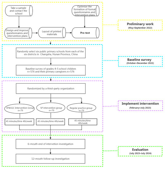 This protocol has been written in accordance with the Recommendations for Interventional Trials statement and is a cluster randomized controlled trial [36]. There are a total of six main urban districts in Changsha, Hunan Province, China, and we will use a two-stage cluster sampling method to randomly select six public primary schools from each of the six districts. All school-age children in grades four to five in each school will be included in this study. Two classes from grades four to five in each school will be selected using a random group selection process, and all students in the class will be invited and voluntarily enrolled in this study. After completion of the baseline survey, the six public primary schools will be randomized in a 1:1:1 ratio into (1) a SGC and SP group; (2) a SP intervention group; and (3) a regular practice group. All groups will receive 45 min of intervention four times a week. A final school year of intervention and follow-up will be implemented for each group, with effects assessed at 6 and 12 months. An overview of the study design is presented in Figure 1.