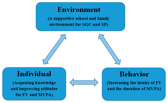 An inadequate intake of fruits and vegetables (FV) and insufficient physical activity (PA) among children have become global health concerns [1,2,3]. Inadequate intake of FV in children not only leads to deficiencies in vitamins, minerals and dietary fiber, which are essential to human health [4,5], but it also increases the risk of many chronic non-communicable diseases in adulthood, such as obesity, diabetes, cardiovascular disease, cancer, etc. [6,7,8,9]. Additionally, insufficient moderate to vigorous physical activity (MVPA) is associated with an increased risk of obesity, metabolic syndrome and mental health problems in children [10,11,12].