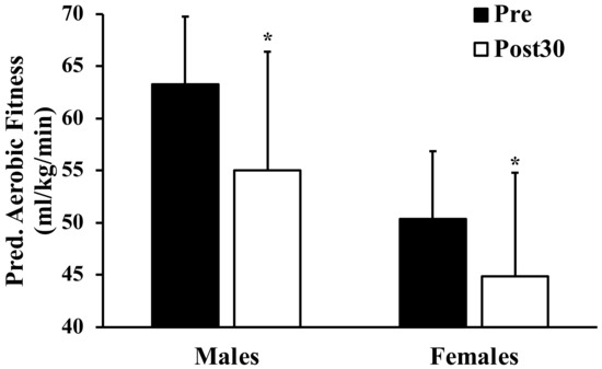 Compared to Pre, Post30 males had a 3.4 cm lower vertical jump height and Post30 females had a 7.3 cm lower broad jump (both, p < 0.045). No differences between cohorts were observed for vertical jump power, sit and reach, Illinois agility test and 50 m sprint (all, p > 0.12). The median and range for 50 m sprint for Pre and Post30 females was 8.2 (6.4–11.9) and 8.1 s (7.0–13.4), respectively. Post30 male’s grip strength was 12.3 kg lower compared to Pre (p < 0.001). Predicted VO2max was lower in Post30 males (63 vs. 55 mL/kg/min), and females (50 vs. 45 mL/kg/min) compared to the Pre groups (both, p < 0.001; Figure 1).