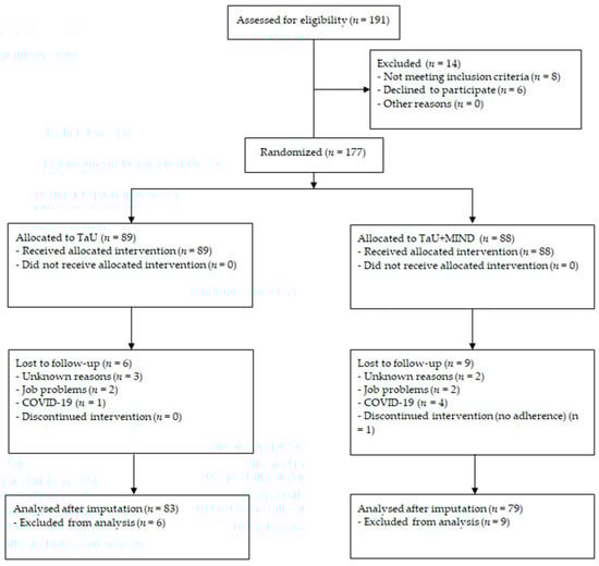 A total of 177 patients were randomized to the two conditions: 89 to TaU and 88 to TaU + MIND (see Table 1 for baseline features). Patients allocated to the TaU + MIND group showed a higher NSAID intake (p = 0.014; mean difference 31.0, 95% CI: 6.4–55.6 intakes/three months). Drop-out rates between the two groups were not different (chi-squared 0.69, p = 0.405): 6 out of 89 (6.7%) among those in TaU, and 9 out of 88 (10.2%) among those in TaU + MIND dropped out in the first three months. See Figure 1 for a study flowchart.