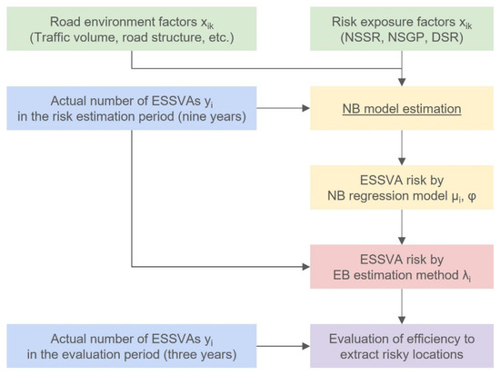 As the second issue, the accident risk of each location may be affected by a great variety of factors specific to the location. It is difficult to incorporate all of the factors as explanatory variables in a statistical model, and the effects of factors other than the explanatory variables are represented as the error term with a probability distribution. Therefore, in assessing accident risks at different locations, it is necessary to properly consider the balance between the average effects of explanatory variables and the effect of location-specific characteristics. While the Empirical Bayesian (EB) estimation method has been proposed and used in the context of a before–after study on the evaluation of traffic safety measures [23,24,25,26,27,28,29,30], it is also applicable to the purpose of extracting locations where countermeasures should be implemented by properly evaluating the accident risks at individual locations [31,32,33,34,35,36,37]. Although there have been some previous studies applying the EB method to evaluate the locational risks of accidents involving general pedestrian [30,33], no studies applying the EB method to assess the locational risks of accidents involving children have been seen.