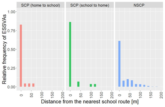 Figure 4 shows the distribution of the occurrence of ESSVAs regarding the distance from the nearest school route by the children’s travel purposes. As expected, most (roughly 80%) of the ESSVAs in SCP occurred on the school routes since children basically walk to school and walk back home along the designated school routes. On the other hand, it is a surprise that most ESSVAs in NSCP also occurred on or close to (roughly within 100 m of) the school routes. This could be an important fact and will be discussed, along with the statistical model estimation results below, in detail in Section 4.