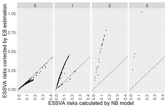 Figure 5 shows the scatter charts plotting the ESSVA risks calculated by the NB regression model () on the horizontal axes and those corrected by the EB estimation () on the vertical axes, according to the number of ESSVAs actually occurred during the risk estimation period shown at the top of the charts (0–3). The 45-degree line is also plotted. It can be seen that in the chart for the intersections where the actual numbers of ESSVAs were zero (the leftmost chart in Figure 5), all points were below the 45-degree line. This means that the expected numbers of ESSVAs were adjusted downward through the EB estimation because the actual numbers of ESSVAs had been smaller than the expected numbers estimated by the NB model. On the other hand, in the chart for the intersections where the actual numbers of ESSVAs were two or three (the right two charts in Figure 5), all points were above the 45-degree line. This means that the expected numbers of ESSVAs were adjusted upward through the EB estimation because the actual numbers of ESSVAs had been greater than the expected numbers estimated by the NB model. Additionally, in the chart for the intersections where the actual numbers of ESSVAs were one (the second left chart in Figure 5), the downward and upward adjustments described above were mixed. It can also be seen that even for the intersections with the same actual numbers of ESSVAs, the further to the right, the greater the difference between each point and the 45-degree line tended to be. This means that the higher the ESSVA risks calculated by the NB regression model were, the larger the magnitude of the adjustment by the EB estimation was.