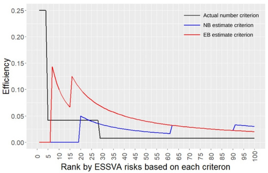 Figure 6 shows the efficiencies calculated by the procedure explained in Section 2.4 based on the three criteria. It can be seen that the actual number criterion had the highest efficiency up to the 6th ESSVA risk rank, whereas the EB estimate criterion had the highest efficiency from the 7th up to about the 60th risk rank. This means that, in this study case, while using the actual number of ESSVAs was more efficient in extracting the top six risky locations, using the EB estimation was more efficient in extracting the risky locations beyond these six locations.