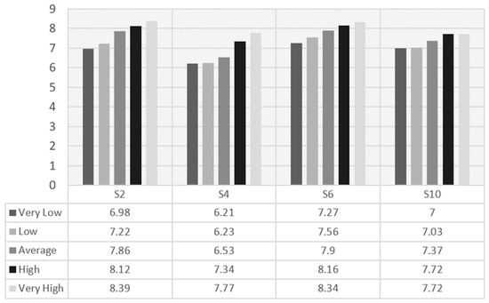 Regarding possible associations between CRF and the different subscales, it was observed that boys’ scores in subscales Revitalization and Enjoyment, Competition, Strength and Endurance, and Challenge rose when the CRF level was increased (see Figure 1). Values are shown according to the average value established by Ortega et al. (2011) [34].