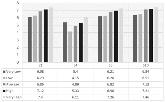 S2 (Revitalization and Enjoyment), S4 (Competition), S6 (Strength and Endurance), and S10 (Challenge) subscales scoring by cardiorespiratory fitness in boys.