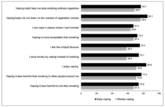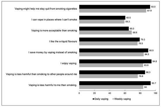 Current smokers who vaped daily were significantly more likely than those who vaped weekly to report vaping for enjoyment, to save money, to reduce smoking, to quit smoking, likeable (e-liquid) flavours, and vaping is less harmful than smoking to themselves and to others (see Table 2).