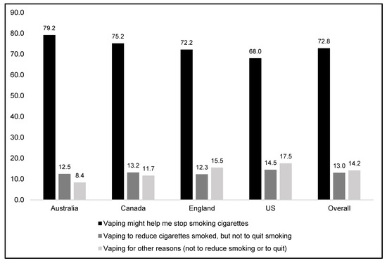 Yong et al. [22], analyzed data from the 2016 (Wave 1) International Tobacco Control Policy Evaluation Project Smoking and Vaping Survey (ITC 4CV) in four countries (United States (US), Canada, England, and Australia) and found that among adults who currently smoke, the most commonly reported reasons for regular vaping were to reduce smoking, to quit smoking, and because vaping is less harmful to others than smoking. Among those who formerly smoked, the most common reasons for vaping were for enjoyment, because vaping is less harmful to others, greater affordability, and to help them stay abstinent from smoking. Many reasons for vaping differed by smoking and vaping frequency (daily vs. weekly), by country, and age.