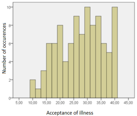 The average level of illness acceptance in the group of respondents was 27.23, with a standard deviation of 8.18. The Shapiro–Wilk test showed that it differed statistically significantly from the normal distribution (SW = 0.964, p = 0.008).