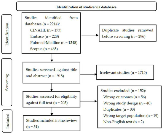 Of the 2214 studies identified during our systematic search, 51 were retained after screening. Figure 1 summarizes the data collection and screening process. The 51 articles kept were published between 1990 and 2020. The pooled population sample from these studies included in this review was 20,947 participants. The total number of female and male participants were 5566 and 8048, respectively (1:1.4; female to male ratio); sex was not reported by the research papers’ authors for 7333 (35.01%) participants. The average age of cases was 50 years (range from 14 to 101); this did not include one study that focused on children involved in a meningitis outbreak investigation [24]. A summary of these articles is presented in Table 1.