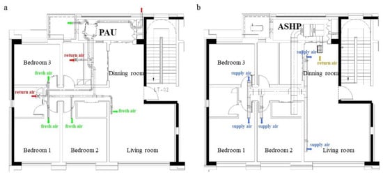 This study selects two apartments as the simulation targets. The apartments use an Air-Sourced Heat Pump (ASHP) to provide heating air using duct and Primary Air Unit (PAU) with heat recovery, as shown in Figure 1.