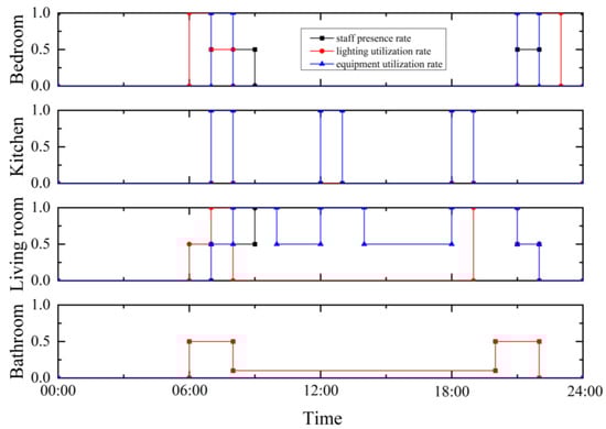 Each apartment includes three bedrooms, a living room, a dining room, a kitchen and two bathrooms. The main parameters of building envelope, ASHP and PAU are given in Table 1. The occupation rate, lighting utilization rate and equipment utilization rate of each room are set in accordance with the “Design Standard for Energy Conservation of Residential Buildings in Severe Cold and Cold Areas” JGJ26-2018 standard, as shown in Figure 2. The lighting density value of each room is set according to the target value of “Architectural Lighting Design Standard” GB 50034-2013 standard. The power density of each room equipment is set according to the function of the room, and the heat dissipation of the human body is set in accordance with ISO7730. For the specific settings, see Table 2.