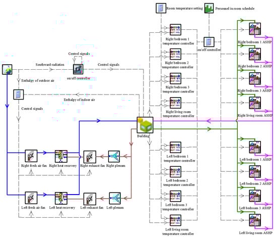 The HVAC system of the selected apartments in TRNSYS environment are given in Figure 3. The HVAC system of the selected apartment consists of three main subsystems: air conditioning system, fresh air system and shading system. The air conditioning system consists of a five-stage thermostat controller (Type 108), an air-source heat pump model (Type 954), a start–stop controller and a personnel-in-room schedule, which turns on the AHSP when the room is occupied and the temperature meets the temperature control requirements. The fresh air system consists of air mixing valve (Type 648), variable air volume fan (Type 147), heat recovery unit (Type 667b) and controller, which controls the start–stop function of the fan and heat recovery unit according to the enthalpy difference between indoor and outdoor air (the fresh air system is in heat recovery mode when all equipment is on, and in bypass mode when only the fan is on). Shading control is achieved by an on/off differential controller (Type2). The differential controller allows for setting a certain value interval when the outdoor solar radiation is higher than this interval to turn on the shading and lower than this interval to turn off the shading; otherwise, it does not change the device status.