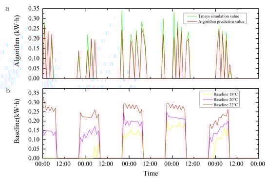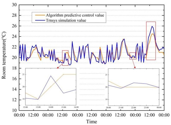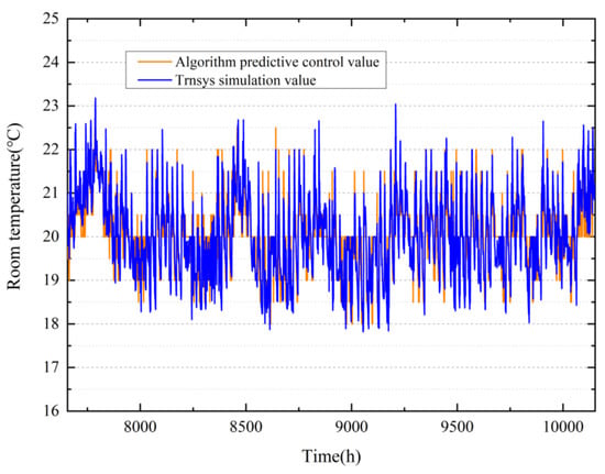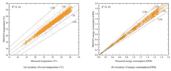 The TRNSYS simulation model was validated using historical operational data of the building in 2021, as shown in Figure 4. Figure 4a shows the TRNSYS simulated value of room temperature compared with the measured value (taking the master bedroom of the right household as an example), and Figure 4b shows the TRNSYS simulated value of HVAC system energy consumption compared with the measured value.