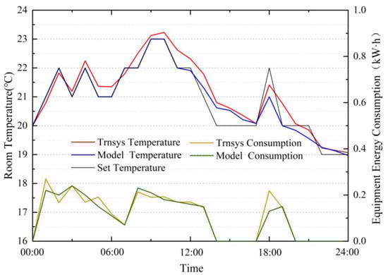 The structure and accuracy indicators of different models are shown in Table 6. The ANN model has the best accuracy. The coupling of the room temperature model with the equipment energy consumption model is divided into two cases: (1) When the ASHP is off, the temperature model directly calculates the room temperature at the next time step, and the equipment energy consumption is zero. (2) When the ASHP is on, the temperature model calculates the maximum temperature (ASHP running at maximum power, PAU off, shading off) and the minimum temperature (ASHP off, PAU on, shading on) that the room can reach at the next time step. If the set temperature is in the possible temperature range or above the maximum temperature, the energy consumption is calculated by the energy consumption model according to the equipment state setting; otherwise, the equipment energy consumption is zero.