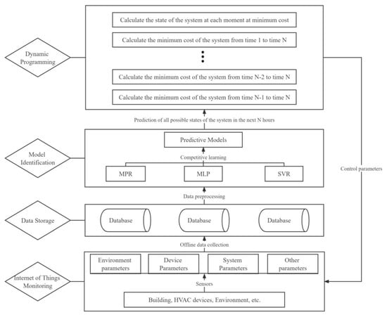 With the gradual extension of people’s living and working hours in buildings, the requirements on the healthier and better thermal comfort indoor environment lead to increasing energy consumptions of the building sector. According to the forecast of the International Energy Agency [], the world energy structure is undergoing tremendous changes, and a new form of global energy is emerging. The new form of energy described in the Net Zero Emissions by 2050 Scenario (NZE) is a cooperative economy in which countries work together to achieve emissions reductions where necessary. One important measure to achieve emissions reduction is to focus on energy efficiency and adjust the energy service demand through behavioral change []. The building sector is responsible for 33% of global CO2 emissions, and HVAC systems are the crucial energy consumer in buildings with the largest share []. Nearly zero energy buildings (NZEB) offer a significant opportunity for both energy use and emissions reduction []. NZEBs have high performance envelopes where the thermal storage capacity of the building itself and its facilities (i.e., floors, ceilings, walls and furniture) can be fully utilized, providing the potential to improve the overall control performance of its HVAC systems. This energy-saving potential of HVAC systems can be tapped through smart control []. A model-based method, such as model predictive control (MPC), is an online optimization method whose basic idea is to use the model of the system under study to predict the future state and minimize a certain cost function within the forecast period. This method is a real-time rolling optimization process, and its optimization results depend on the prediction accuracy of the model used.