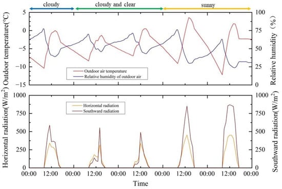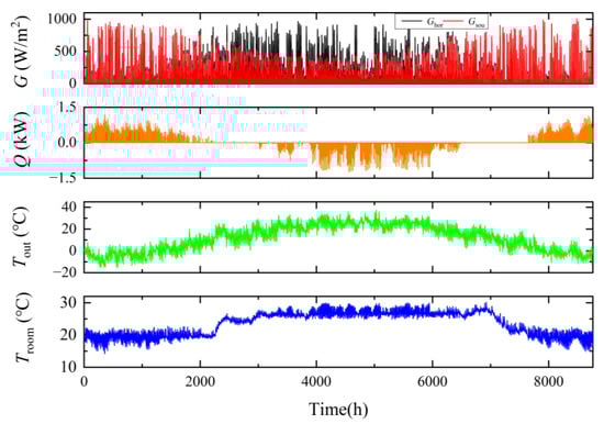 A whole year simulation is carried out. In parameter identification, the system inputs include: (1) outdoor weather conditions, including outdoor air temperature, outdoor air enthalpy, outdoor air relative humidity, solar horizontal radiation and southward solar radiation; (2) internal gain (), including lighting load, equipment load and human body heat dissipation; (3) the heating and cooling output of the air conditioning equipment (Qk), which is calculated from the volume of the circulated air flow and the temperature difference between the supply and return air. The system outputs include: (1) room air temperature of the main zone and (2) the energy consumption of air conditioning equipment.