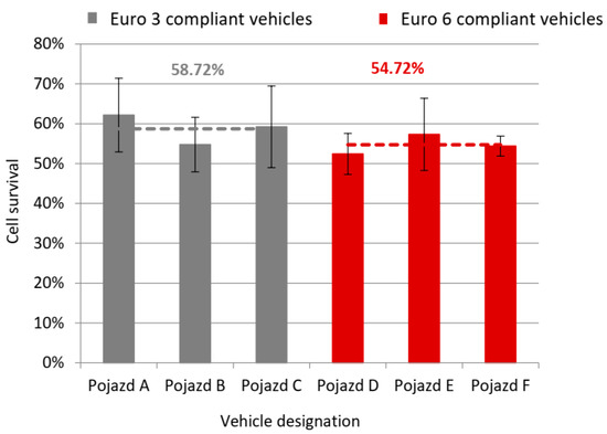 The graph (Figure 1) shows the average survival rate of cells after exposure to engine exhaust gases of individual vehicles. The dotted line indicates the average cell survival rate for vehicles meeting the Euro 3 standard, 58.72%, and the Euro 6 standard, 54.72%. The results showed that the cell survival rate for vehicles complying with the more restrictive Euro 6 standard was 4% lower than that of Euro 3 compliant vehicles. The mean cell survival rate for each vehicle was calculated from three trials. The mean standard deviation error for Euro 3 compliant vehicles was 8.78% and for Euro 6 compliant vehicles, 5.57%. In order to check the statistical significance of differences in the values of cell survival for the two groups of vehicles, Student’s t-test was performed for independent samples. The value of the t-Student statistics was 0.876. For 4 degrees of freedom, the significance level was 0.43. The critical value read from the distribution table was 0.7407 and was lower than the determined value of the Student t-statistic. This means that the level of significance of the results is lower than that assumed in the table, and therefore the difference in the mean cell survival values for both groups of vehicles is not statistically significant. However, this does not mean that the results are not significant at all.