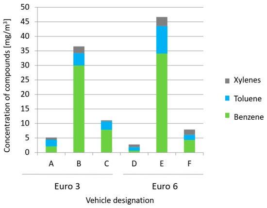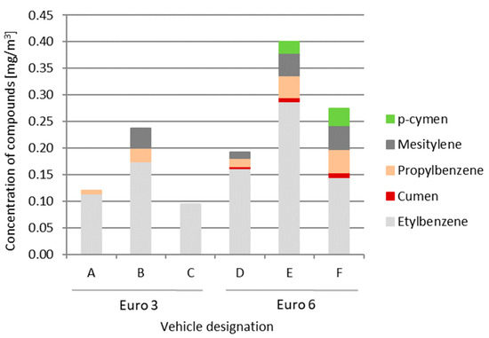 For Euro 6 vehicles, the variety of compounds is greater than for Euro 3 vehicles (Figure 3). Cumene and p-cymene are not found in older vehicles compliant with the Euro 3 standard. Propylbenzene and mesitylene are also compounds found more frequently in the Euro 6 group. The highest concentration of compounds from the aromatic hydrocarbons group was recorded in vehicle E (47 mg/m3). The values were several times higher than those of other vehicles.
