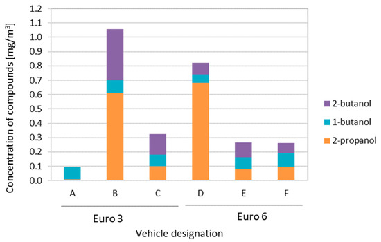 Three different compounds were detected among the alcohols (Figure 4). The highest total concentration of alcohols was recorded for vehicles B and D. In the group of paraffinic hydrocarbons for each of the vehicles, the presence of one compound—n-pentane—was recorded.