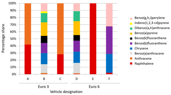 For vehicles B and D, benzo(a)pyrene accounted for the largest share of PAH emissions and only for these two vehicles was its presence recorded (Figure 5). Although benzo(a)pyrene is treated as an indicator of PAH air pollution, the presence of many other toxic compounds was noted in the exhaust gases of half of the vehicles studied. In vehicle F, no benzo(a)pyrene was registered, but the presence of chrysene, benzo(b)fluoranthene and benzo(g,h,i)perylene was recorded. In the whole group of PAH compounds for vehicle E, only one component was determined—naphthalene. For vehicles A and C, naphthalene and anthracene were identified. For vehicles B and D, the greatest variety of compounds present was recorded.