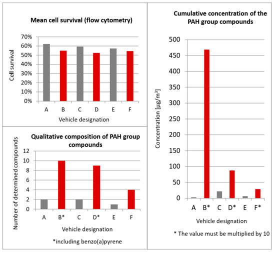 Considering the mean cell survival rate and the qualitative and quantitative composition of compounds from the polycyclic aromatic hydrocarbon group, certain regularities can be observed. Relevant graphs are presented to illustrate the occurring correlations (Figure 6). For vehicles B, D and F, the lowest values of percentage cell survival and the highest concentration values of compounds from the PAH group were recorded, as well as the highest number of compounds determined in this group (marked in red in the tables). For vehicles B and D, the presence of benzo(a)pyrene in the exhaust gases was identified and it was for these vehicles that the lowest cell survival rates were recorded.