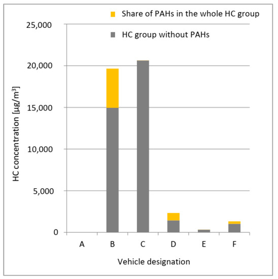 For vehicle A, no increase in HC was observed during the operation of the engine. Considering the very low PAH concentration value for vehicle A, it can be concluded that the exhaust gas analyser used had insufficient measurement accuracy. The highest share of PAHs in the whole hydrocarbon group was recorded for vehicles B, D and F. Vehicle C, despite high concentrations of the entire hydrocarbon group, did not contain a significant amount of polycyclic aromatic hydrocarbons.