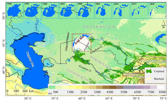 Geographic location of the Aral Sea in arid Central Asia and the change in area of the Aral Sea from 1960 to 2020. The annual area of the Aral Sea was derived from Landsat data; the cropland and bareland were extracted from the Global ESA CCI land cover classification map in 2020, with a spatial resolution of 300 m.