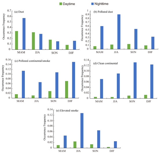 Seasonal and diurnal variations in occurrence frequency of aerosol subtypes in the daytime and nighttime from 2007 to 2021: (a) dust; (b) polluted dust; (c) clean continental; (d) polluted continental/smoke; (e) elevated smoke.